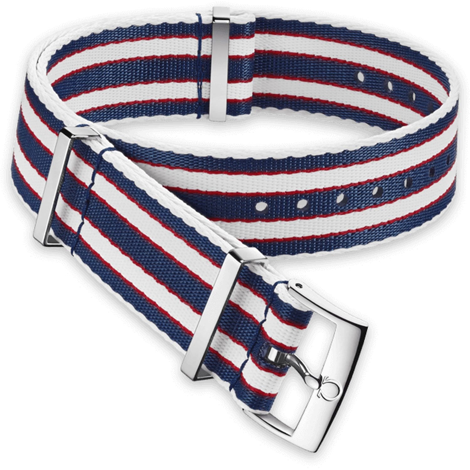 Original OMEGA NATO strap in polyamid textile with a multicolour striped design, featuring a 20mm standard buckle. See the table below for suitability for your OMEGA model.