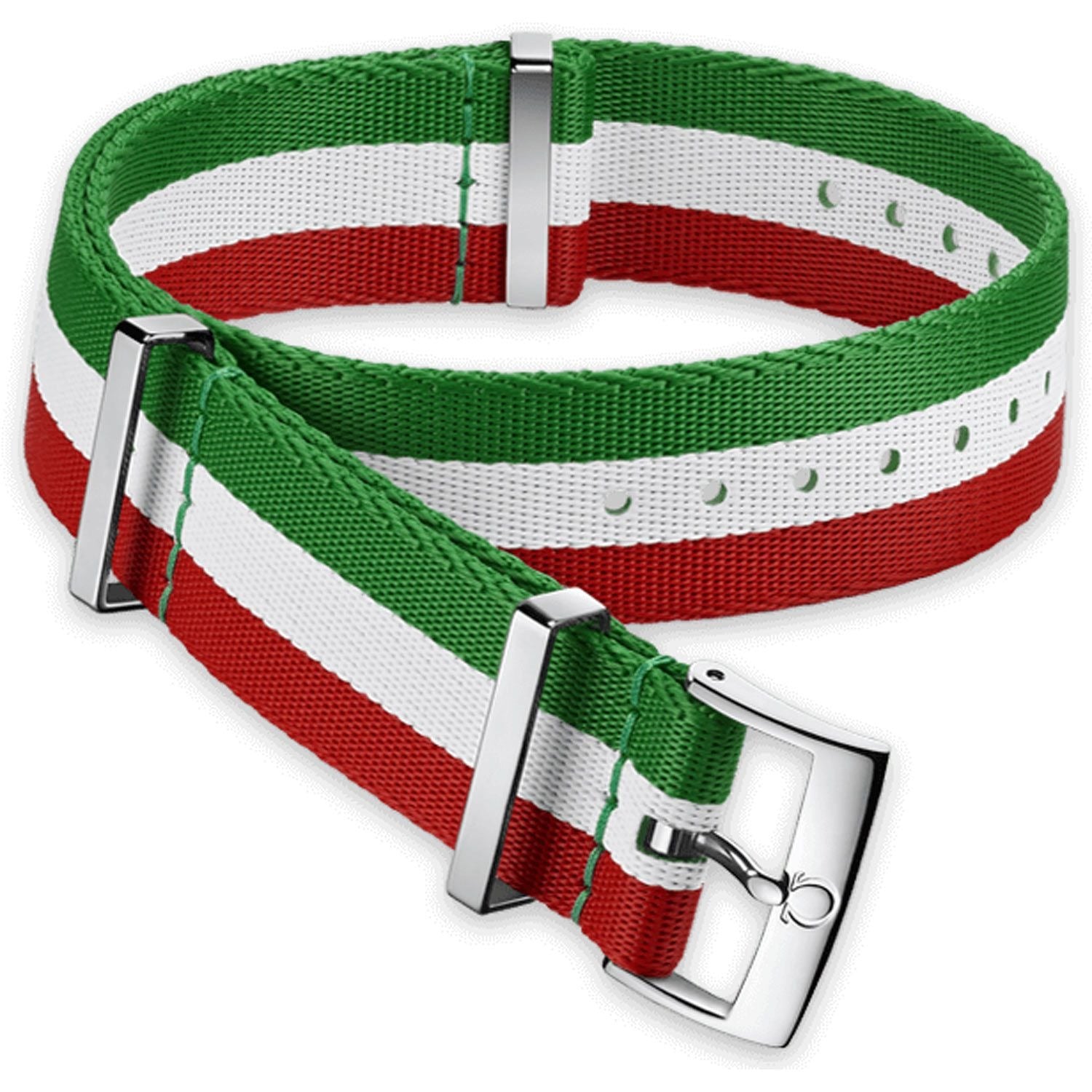Original OMEGA NATO strap in polyamid textile with a green, white & red striped (Italian flag) design, featuring a 22mm standard buckle. See the table below for suitability for your OMEGA model.